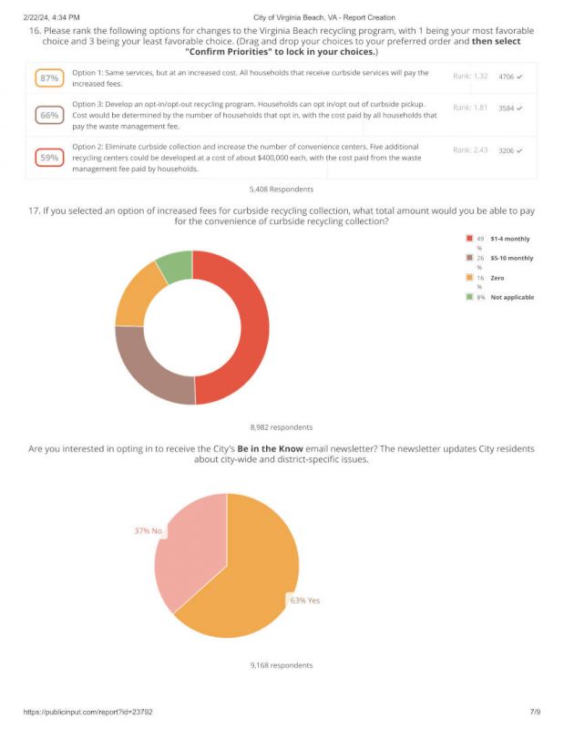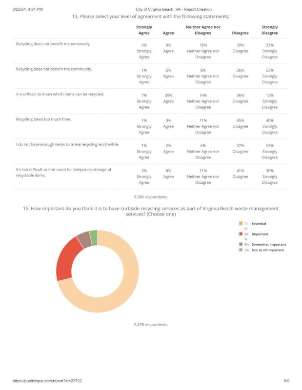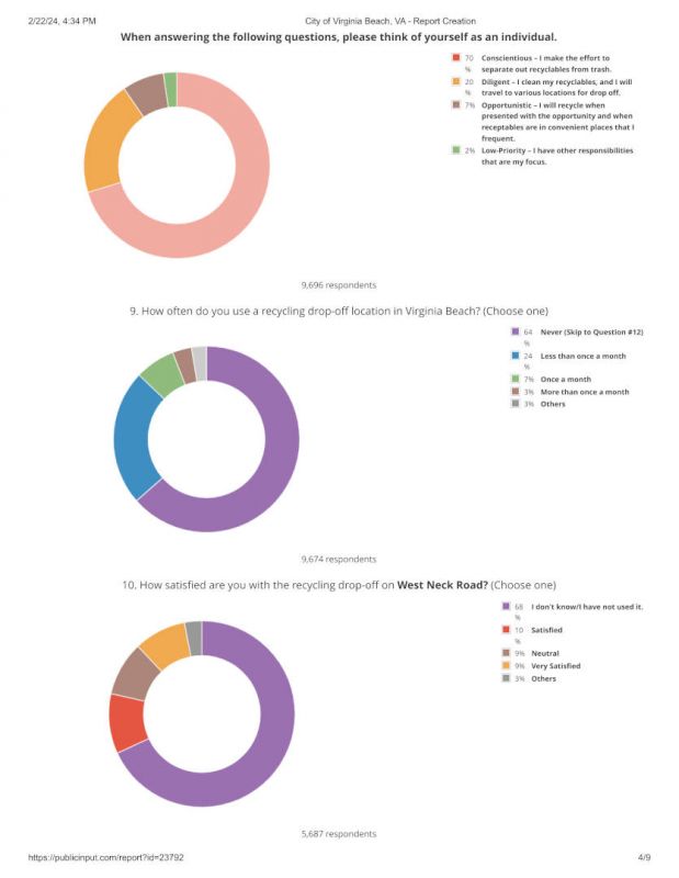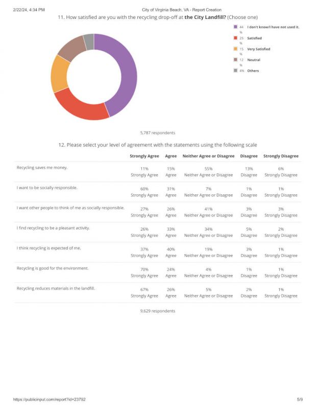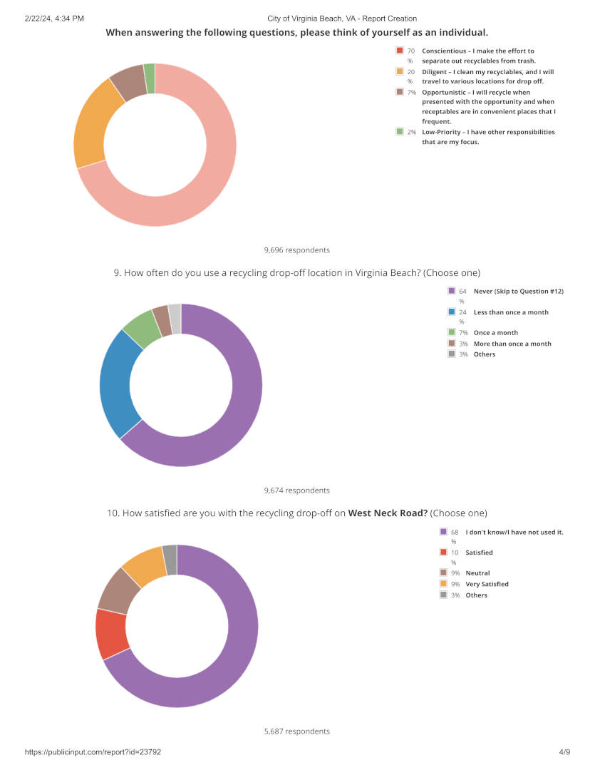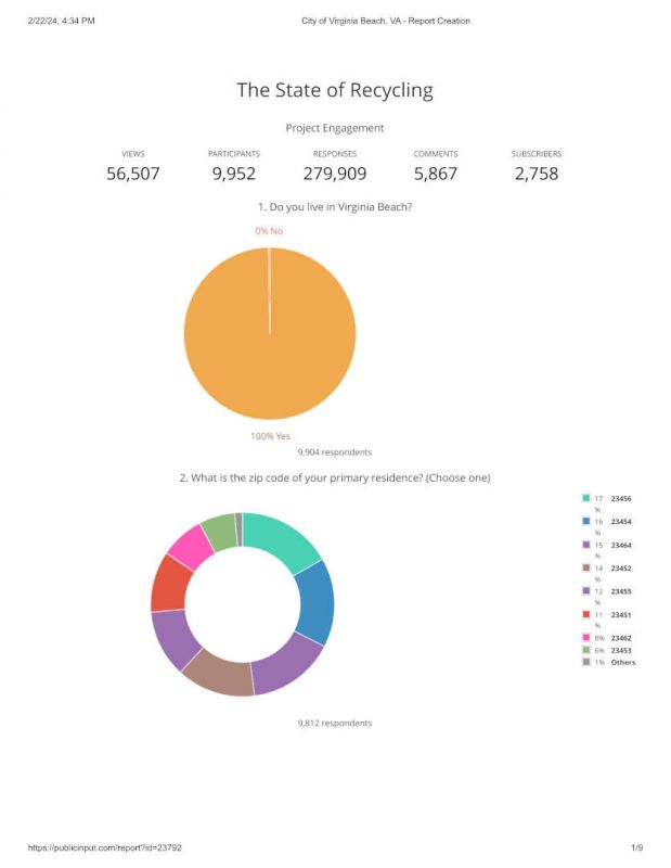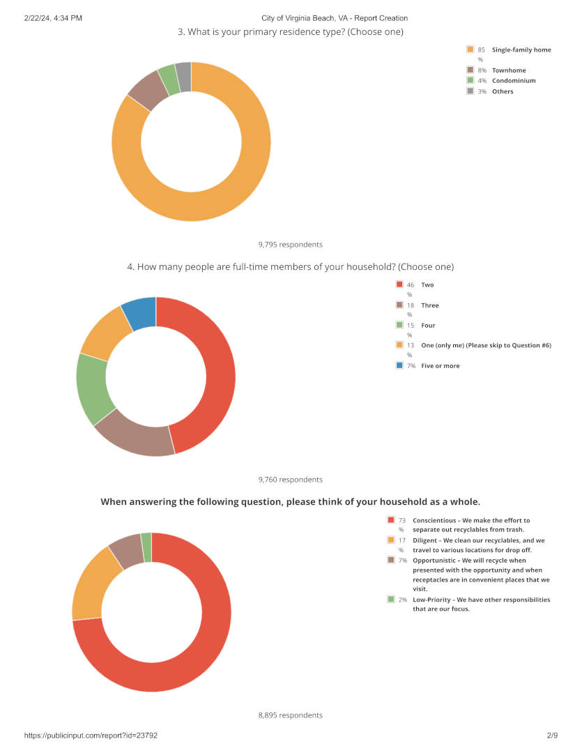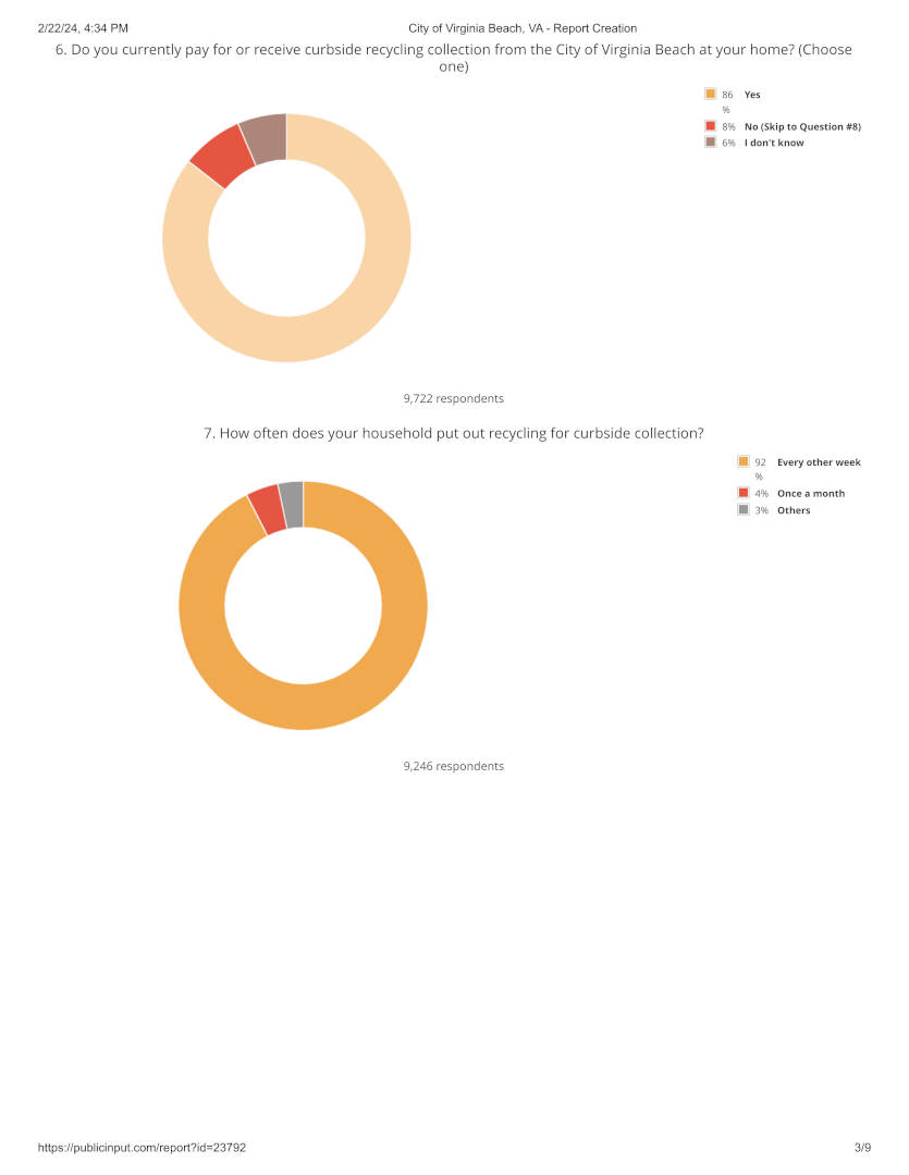 In a survey recently conducted by the City of Virginia Beach asking its residents about the recycling services they’re provided and how they use them, 4706 of 5408 respondents, or 87% said they want the same curbside recycling service provided by TFC Recycling that they have now, even if the city increased the fees they charge.